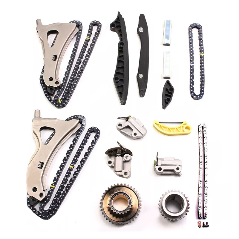 టైమింగ్ చైన్ కిట్ అనేది ఆటోమోటివ్ ఇంజన్లలో ఒక ముఖ్యమైన భాగం, ఇది కాంపాక్ట్ మెటల్ నిర్మాణం, అధిక ప్రసార సామర్థ్యం మరియు జీవితాంతం దాదాపు నిర్వహణ ఉచితం. ఇది ప్రధానంగా ఇంజిన్ యొక్క వాల్వ్ మెకానిజం డ్రైవింగ్పై పనిచేస్తుంది, సరైన సమయంలో కవాటాలు తెరుచుకోవడం మరియు మూసివేయడం మరియు సాధారణ చూషణ మరియు ఎగ్జాస్ట్ ప్రక్రియలను సాధించడం. అదే సమయంలో, సైలెంట్ టైమింగ్ చైన్ దంతాల ఆకృతి డిజైన్ ద్వారా శబ్దాన్ని తగ్గిస్తుంది, ఆపరేషన్ను సున్నితంగా చేస్తుంది మరియు దీర్ఘకాలిక నిర్వహణ ఖర్చులను తగ్గిస్తుంది. టైమింగ్ చైన్ కిట్ అధిక లోడ్ కెపాసిటీ మరియు హై-ప్రెసిషన్ ట్రాన్స్మిషన్ను కూడా కలిగి ఉంది, ఇది అధిక-వేగం మరియు అధిక-ఉష్ణోగ్రత వాతావరణంలో ఇంజిన్ యొక్క పని అవసరాలను తీర్చగలదు మరియు మెకానికల్ పరికరాల విశ్వసనీయత మరియు సామర్థ్యాన్ని మెరుగుపరుస్తుంది.